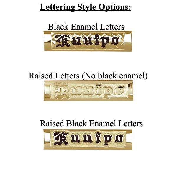 Sterling Silver Personalized/Custom Made to Order 10mm Plumeria and Scroll Bangle. This bangle features plumeria & scroll design, traditional Hawaiian heritage font, black enamel, and straight edge. Bangle is made with solid 14KT yellow gold in 1.75mm thickness. Hand carved in Honolulu, HI.