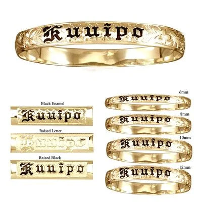 Sterling Silver Personalized/Custom Made to Order 12mm Plumeria and Scroll Bangle. This bangle features plumeria & scroll design, traditional Hawaiian heritage font, black enamel, and straight edge. Bangle is made with solid 14KT yellow gold in 1.75mm thickness. Hand carved in Honolulu, HI.